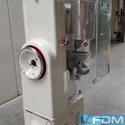 Tabletten-Ø/Diagonale max. 60 mm bei Einfachwerkzeug, Fülltiefe max. 40 mm, Leistung max. 1.800 Tabl./h. bei Einfachwerkzeug, Drehzahl stufenlos verstellbar, Preßkraft max. 80 kN, 1 Tablettierwerkzeug Oblong 59 x 17,5 mm, bikonkav mit Bruchkerbe, Maschine wurde in den letzten Jahren regelmäßig gewartet von Fachwerkstatt für Tablettenpressen (Fa. Luxner/Berlin) und Bronzebuchse/Exzenter neu eingeschliffen , Plexiglas-Einhausung, Anschluss 380V/50Hz